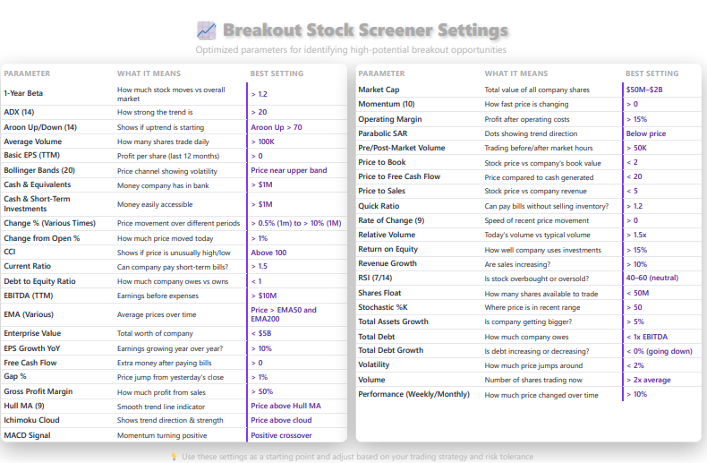 Your one-glance checklist for scanning only the strongest breakout setups — no fluff, just data that moves markets.